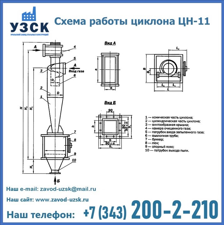 При этом ощутимой разницы в цене между универсальным и узконаправленным, подобранным в соответствии с конкретными техническими требованиями циклоном, нет. Стоимость воздухоочистительного оборудования типа циклон обусловлена маркой и толщиной стали, из которого он изготовлен, сложностью и специфичностью конструкции, наличием дополнительного оснащения (бункер, улитка и другие). При необходимости, на заводе УЗСК в Ногинске будет изготовлен циклон по индивидуальным техническим чертежам заказчика.