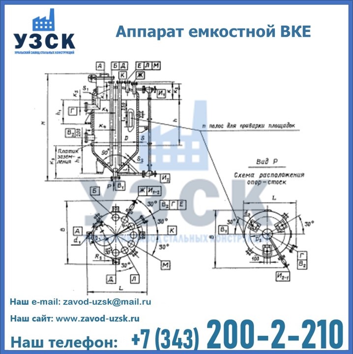 Емкостные аппараты ВКЭ представляют емкость с эллиптической крышей и коническим днищем. аппарат может использоваться в Ногинске для приема и хранения жидкостей и взрыво- и пожароопасных веществ. Создаваемое давление не должно превышать 0,6; 1,0 МПа. Емкости ВКЭ выполняются как цельносварные. Используется марка стали, отвечающая степени агрессивности продукта и температуре эксплуатации.