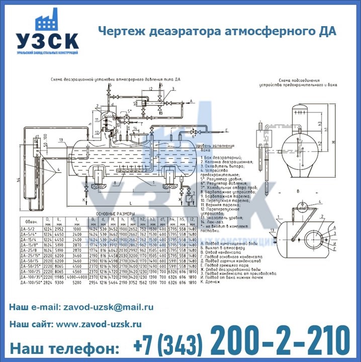 Приобрести качественное оборудование, в том числе, деаэраторы ДА, можно в компании УЗСК в Ногинске. Мы предлагаем долговечную и надежную продукцию по приемлемой цене. Заказать и купить деаэраторы или другие изделия высокого качества можно через сайт Уральского Завода Стальных Конструкций, или позвонив по указанному в разделе «Контакты» телефону.